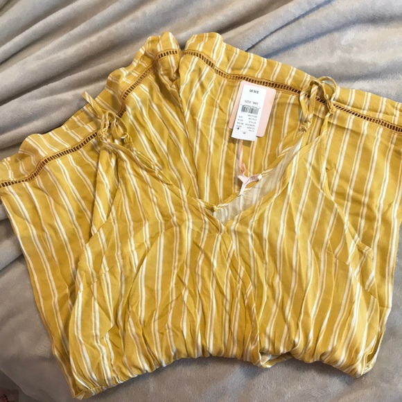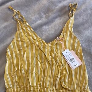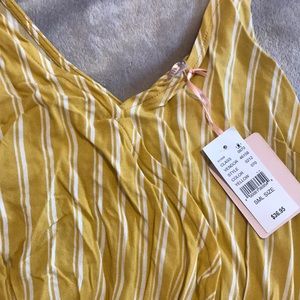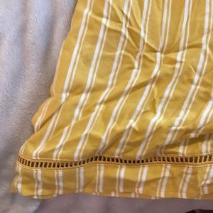 A white on yellow striped summer romper. With a breathable fabric and v cut.