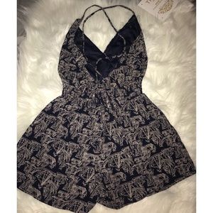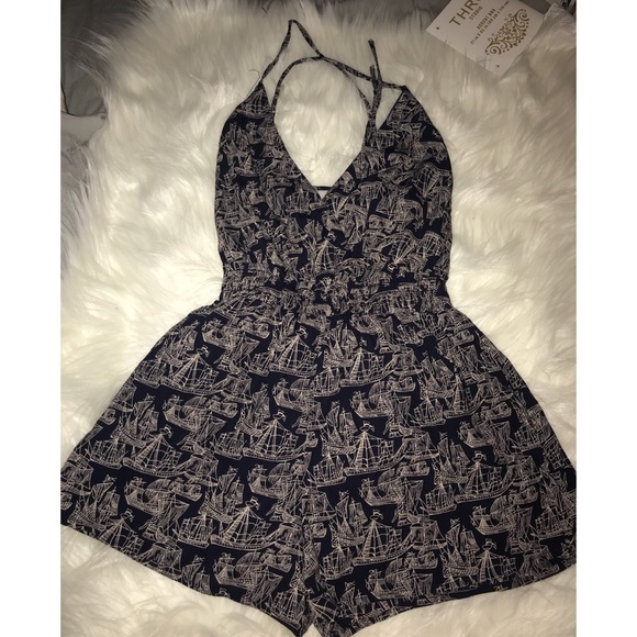 Navy blue romper with gray. It has Sailor designs on it. Worn twice. I'm good condition no damage. Perfect for the summer. It has a cute criss cross design in the back.