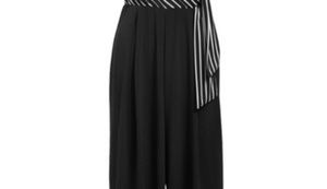 Navy blue and white stripped romper, tied at waste, solid flair bottom. Great for work or a night out.
