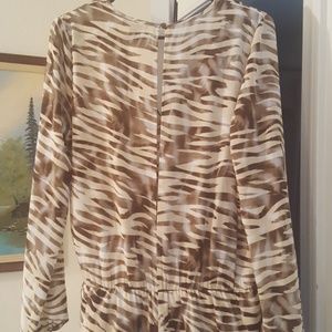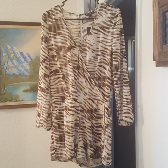 Multi color romper with pockets. Long sleeve. Elastic at end of sleeve so you can push up sleeves.