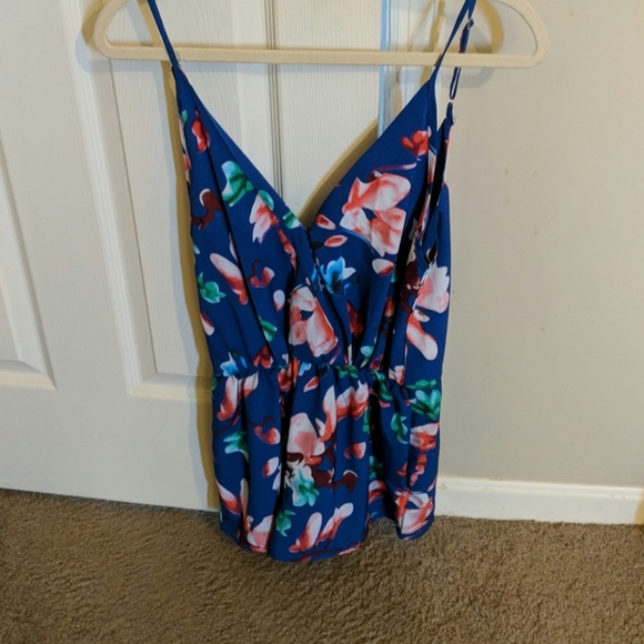 Blue romper with pink flowers. Spaghetti straps with a low back