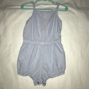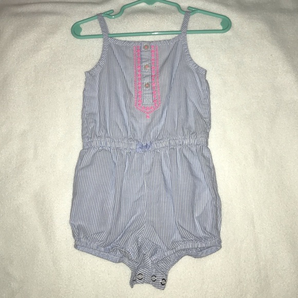 Blue and white striped romper with pink flower design on front with buttons!