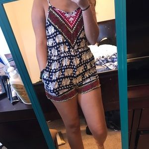 Cuteeee romper! Cool elephant/floral pattern. Dark navy blue, red, white, and deep forest green color. Adjustable straps. Cross cross strap back. Pockets!! Size small. I’m 5’4 and weigh 135