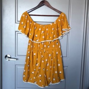 Off shoulder, ruffle top romper with daisies. Cinch waist with lace detail on ruffle top and legs. WORN ONCE.