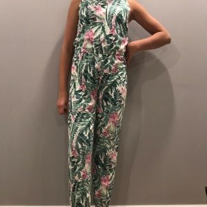 Green white pink flowered romper