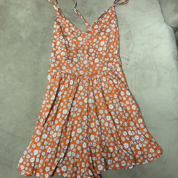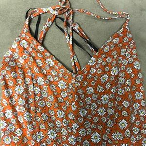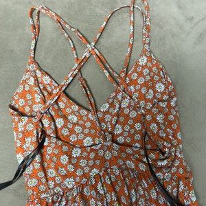 This romper is is adorable, but I didn’t try it on when I bought it and it was too short on me. The back is open and it’s hard to tell but the straps cross in the back. It looks awesome with a Jean jacket!!