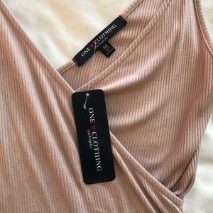 New with tags. Blush romper with cross front detail. Can tie straps to adjust shoulder height. Size M (2-4)