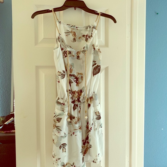 Floral romper with gold rope straps (adjustable) with pearls on the ends. Has pockets!!! Also somewhat see-through, so select undergarments with care