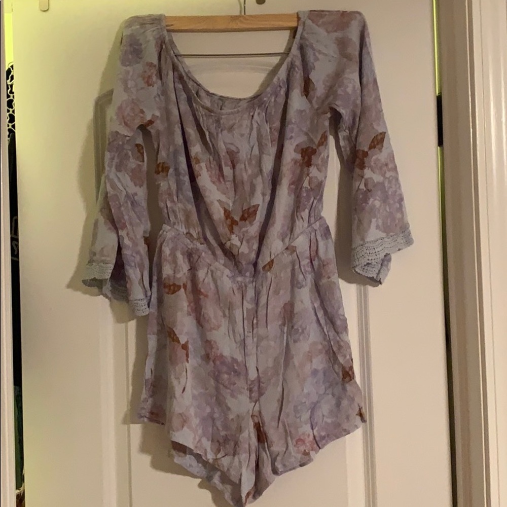Multi colored off the shoulder romper, with lace detail on bottom of sleeves