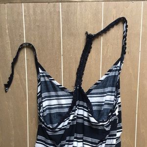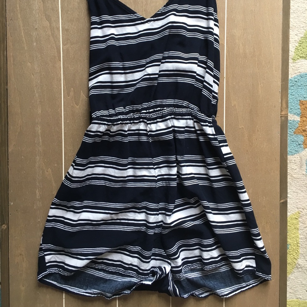 Black and white striped romper with elastic at the waist.