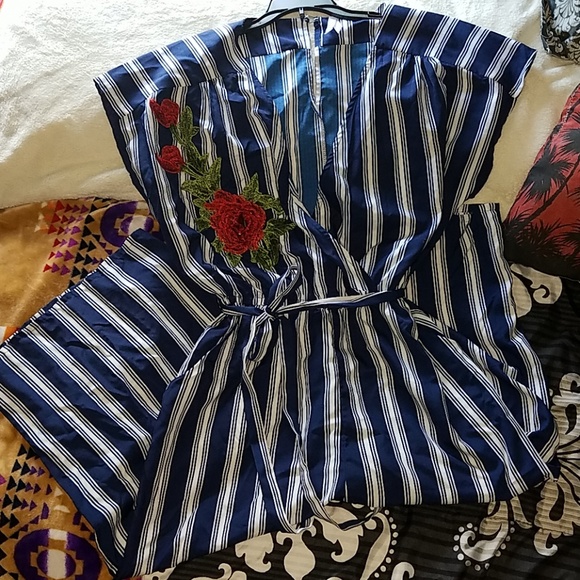Its blue and white with a red a rose. Its a large and a little strechy in the waist. I've never worn it, it was given to me by a friend. Its long pants but short around the ankles.