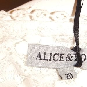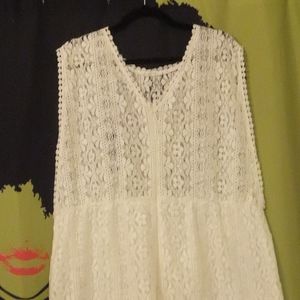 Gorgeous off white sleeveless lace romper. Completely lace with lined bottom. Hidden zipper in back with white pull tab. Rounded front collar and V back. Machine washable. Size UK20= US16-18.