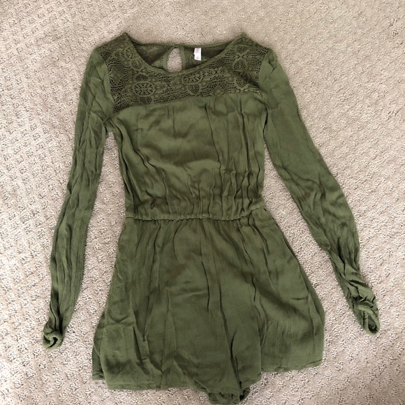 Cute green long sleeve romper with lace detailing on the top