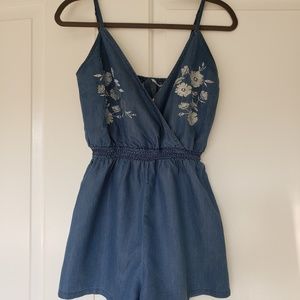 Adorable blue/denim like romper. Cinched waist so it is meant to be high waisted. Has cute detailing on the top and is very comfortable to wear.