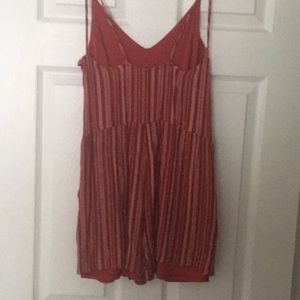 A red and white striped romper with an open back,readjustable straps, and deep pockets