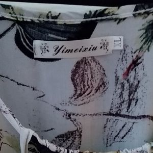 Floral with green, browns and tan background. Strappy sleeves and cute drawstring waist with tassel.