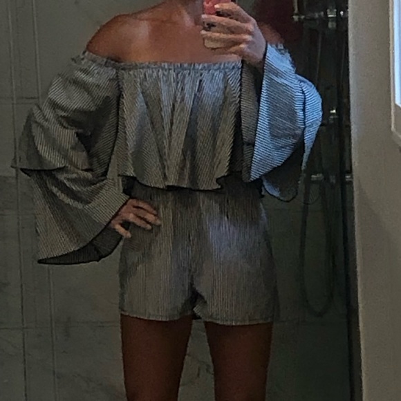 Black and white off shoulder romper. Never worn. Perfect condition. Tiered sleeves.