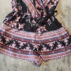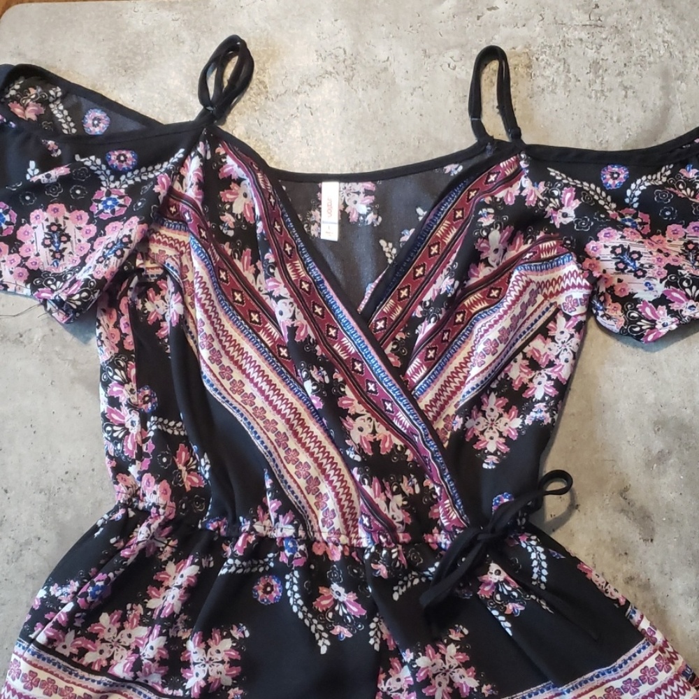Black, Pink and Blue Romper with a Floral Design. Off the Shoulder. Size L. I bought the wrong size and it has never been worn!
