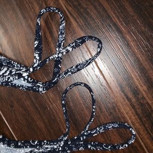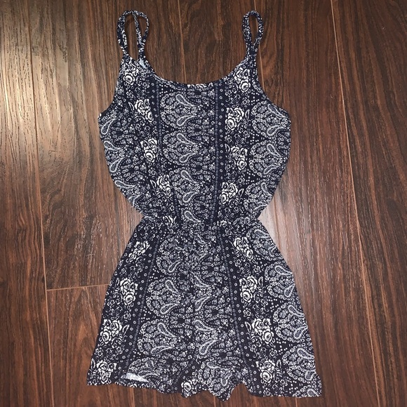 A navy blue romper, comfortable & stretchy. The pattern is almost like a bandana. I posted two pictures of the straps to show it’s two straps that are sewn together as one. Size s