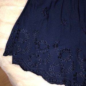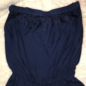 Strapless romper in a dark navy blue color, with beautiful floral stitching along bust and bottom shorts