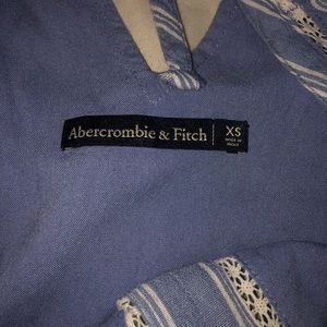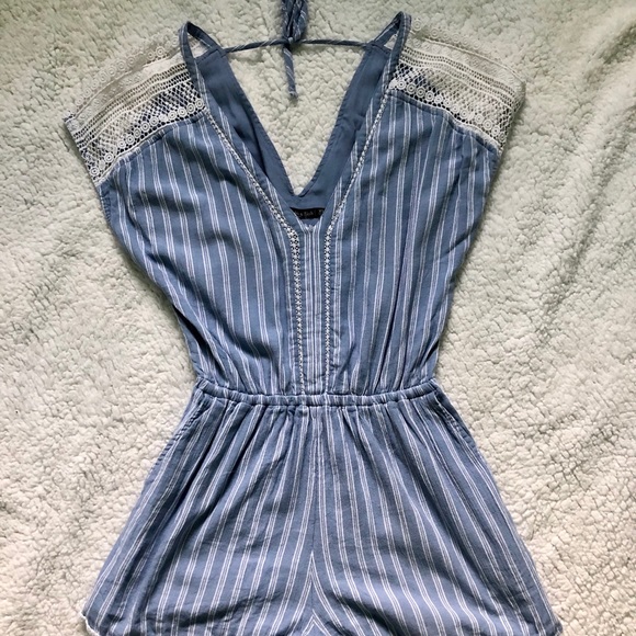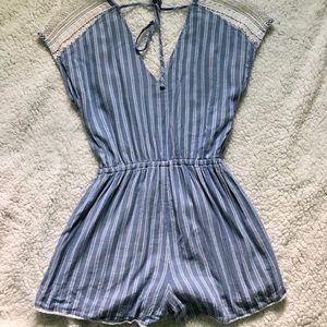 Adorable light blue and white stripped romper. With lace on the shoulders and around the bottom. Has an adjustable tie in the back. In great condition no tears or stains!:)