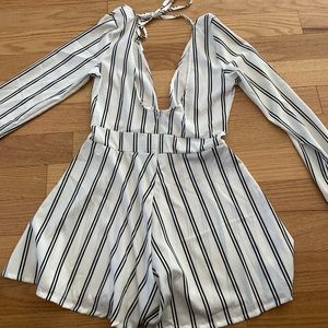it’s a romper i never wore and am just trying to get rid of. it ties in the back, and has a half revealing front. it’s a size small! i can’t remember where i got it from, but it’s good quality and i wanna day its a polyester material.