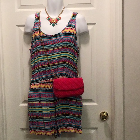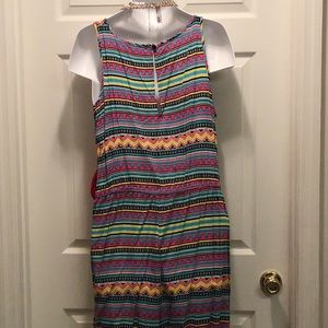 Tribal print tank romper. Small rip at seam in back shown in the 2nd photo. Probably can be sewn by a seamstress. Keyhole button back.