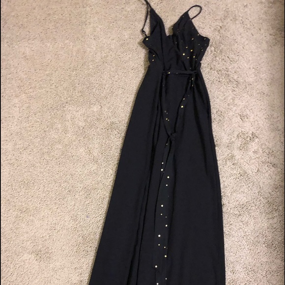 Black one piece jumpsuit/romper. Flared legs and fitted body. Gold accents on belt. Pet free, smoke free home. Excellent condition, worn once.