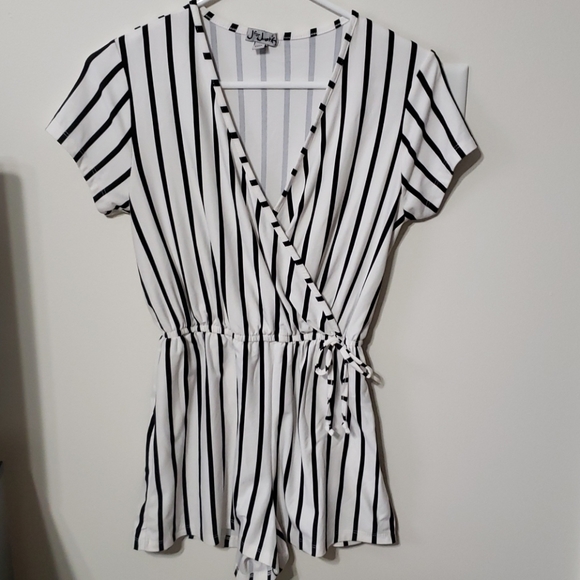 Black and white stripes romper with elastic waist. Made of soft fabric.