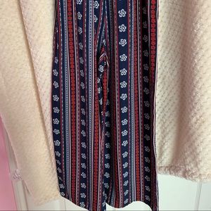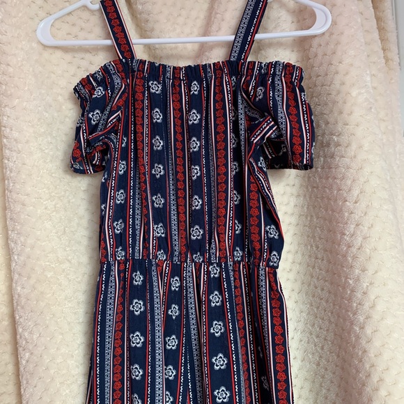 A dark blue , red , and white long romper . A little tight on waist. In great condition. A off the shoulder with straps .