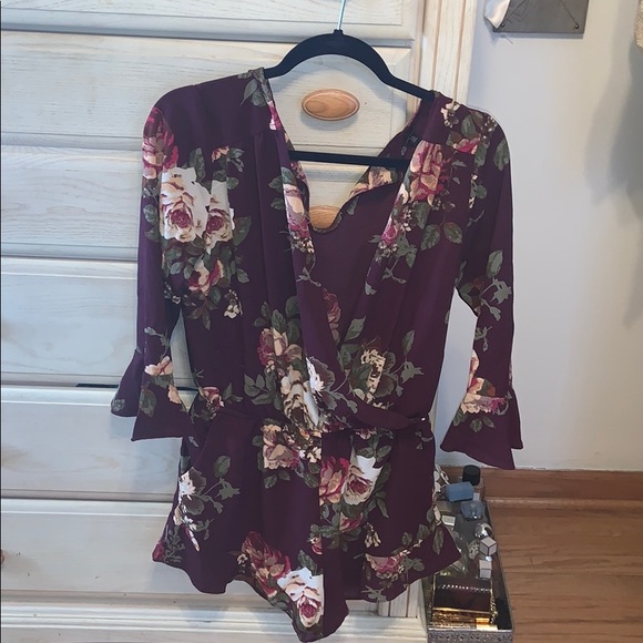 Burgundy/wine color romper super comfy little ruffles on the sleeve and bottom. From a boutique!