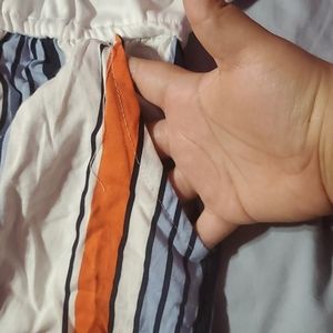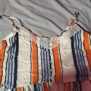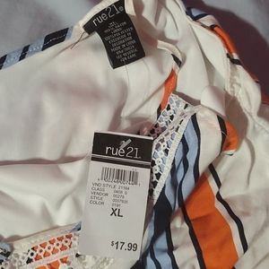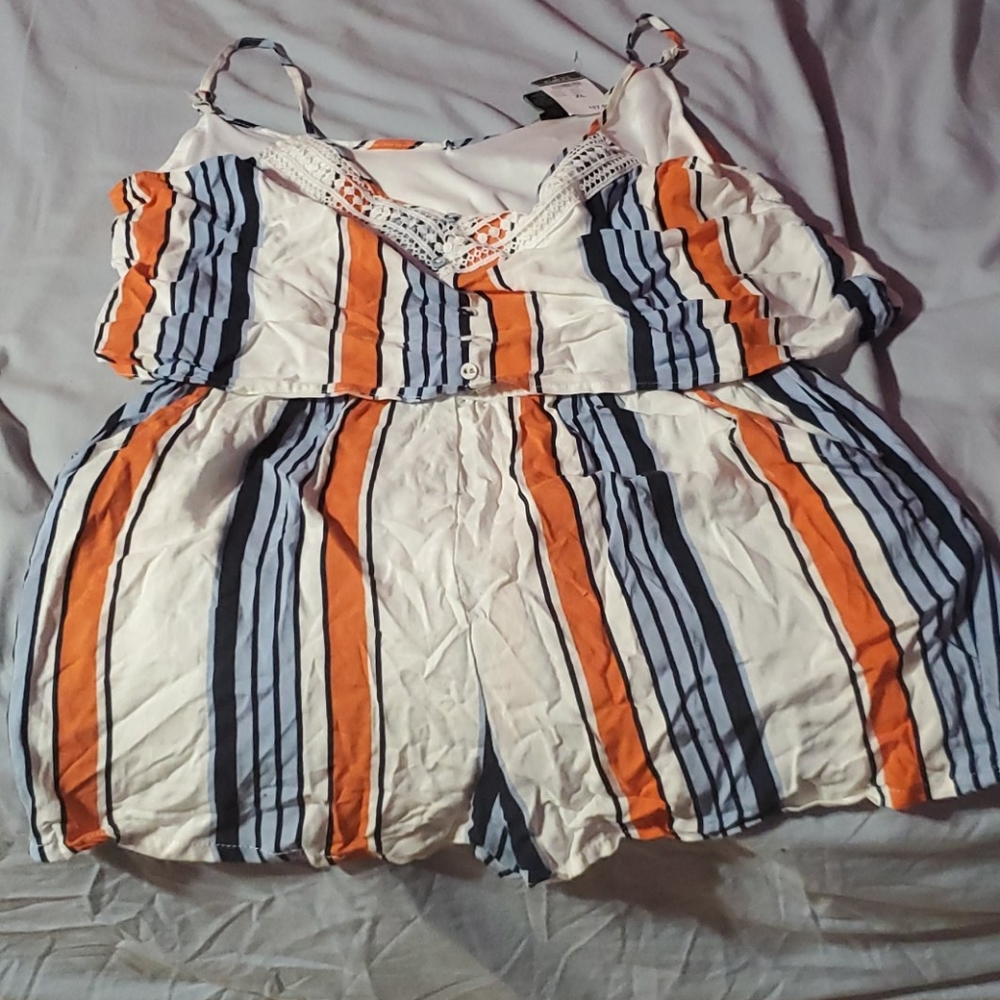 This is a cute orange blue white stripe romper. Never worn and with its tag. I didn't fit me. Its a XL from rue 21. In perfect condition. Its a shorts romper. Has pockets.