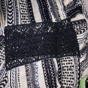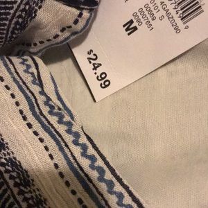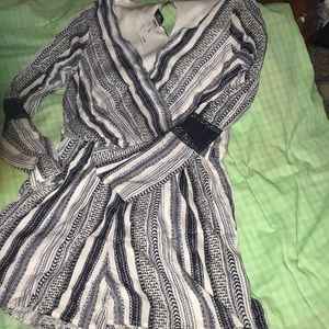 Dark navy blue and white very lightweight 3/4 sleeve romper with a blue embroider partially down and see that flares sleeves outward NWT