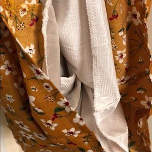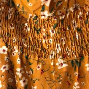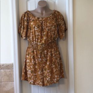 Never worn! Cute flowered romper with elastic neckline you can wear on or off the shoulders. It has an elastic waistline with a tie closure. This is short sleeves and the shorts measure 15 inches from the waist. Adorable mustard color with white flowers and a pop of red in the flower. Very cute romper also lined on the inside
