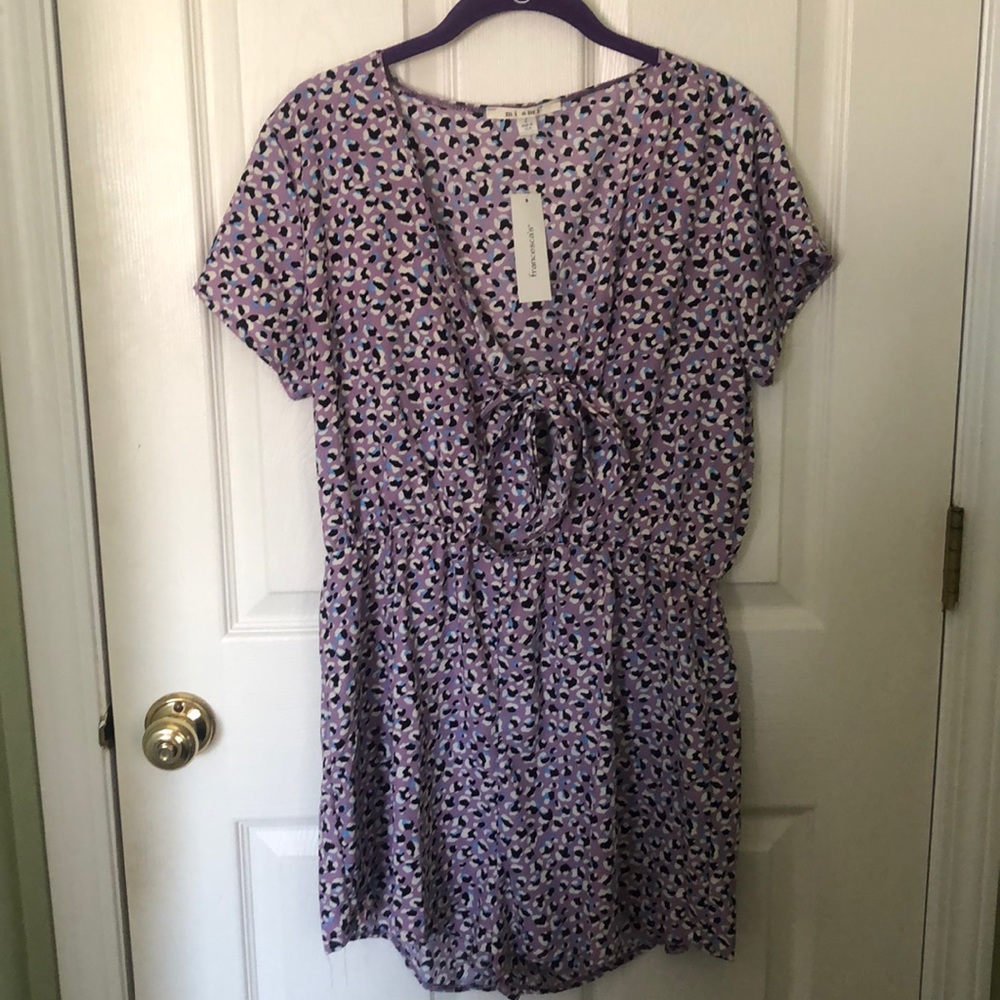 Adorable romper! Light purple, with light blue, black, and white pattern. Ties closed in the front. Romper has an opening under the tie, which can be tied to show more or less skin. Never worn, brand new with tags!