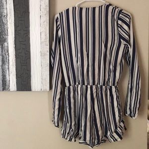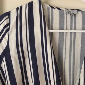 Blue and white striped Tobi romper. Super soft and so comfy! Perfect as a bathing suit cover up or just as an outfit. Ties in the front