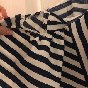 Striped romper with flutter off the shoulder sleeves & spaghetti straps.