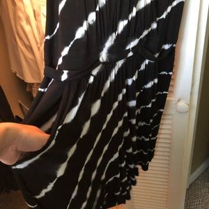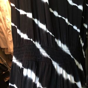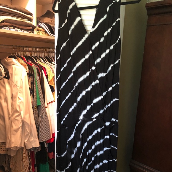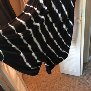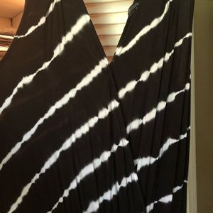 Women’s blk/wht romper. This is very stretchy, flowy and lightweight. Almost looks like a dress when on. Elastic in back of waist and pockets.