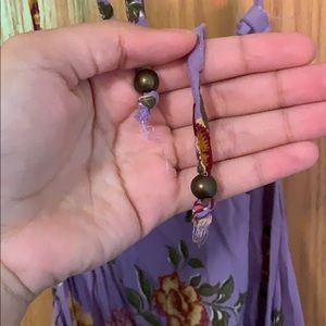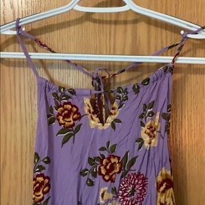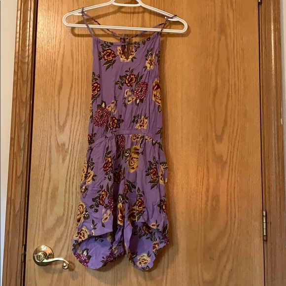 This beautiful romper is purple with yellow, maroon, and burgundy flowers on it. It’s in great condition and made of light material. It has ties for the neckline, and an open back with elastic at the back and waist. I’m a little over 5”5 and it hits my upper thigh. It’s sized a large but it fits like a medium or possibly a small depending of your body type. Feel free to ask questions!!!!!<3