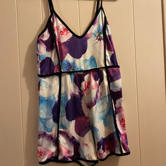 Purple and blue romper. Perfect with a light jacket for date night. Pair with some blue sandals. Has a cute supper in the back. Worn a few times 🌀🤤