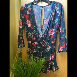 Blue colorful romper . Deep v cut
