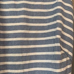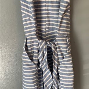 Blue and white stripped romper. zips up in the back with tie accent. Has pockets. Wide leg
