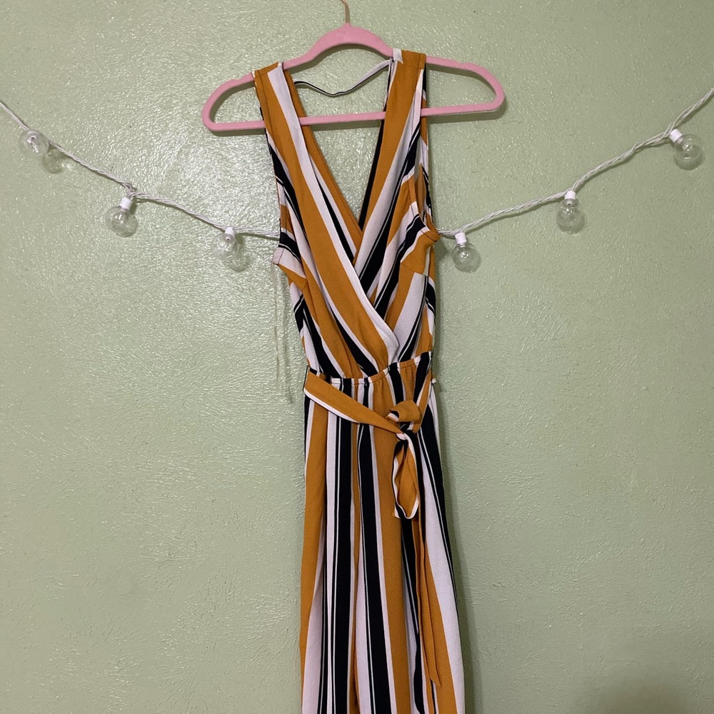 Mustard yellow, blue, and white striped romper