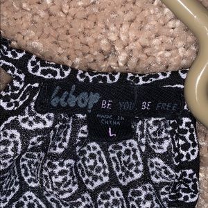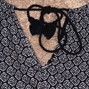 Black and white patterned romper, size large (included a picture of it on), front has a small cutout and ties together with ropes that have tassels at the end, the back has clasps at the top. Very comfortable, only worn once, and in perfect condition