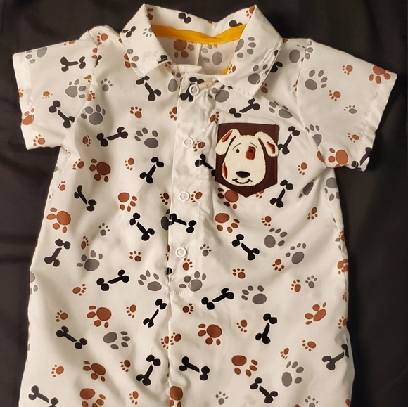 Cute baby boy romper with brown doggies. I iron on a doggie head on the chest. Collar and short sleeves.