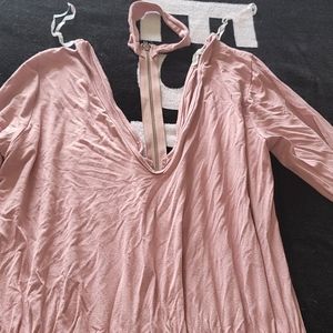 Light pink romper long sleeve with zipper in the back attached to the design around the neck material has a lot of stretch and is very soft and comfortable