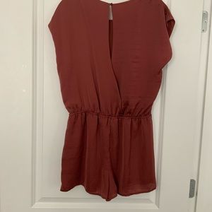 Copper/Rust colored romper with an elastic waistband and narrow back cutout detail. I believe the fabric is silk. Never worn.