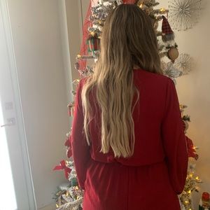 Super cute romper! The color is wine, on the front you can tie it and make a knot or a bow and has a little opening in the tummy area.