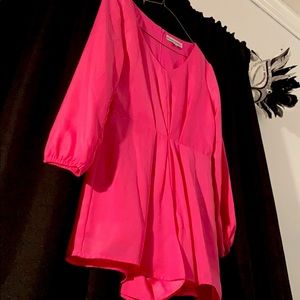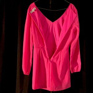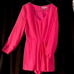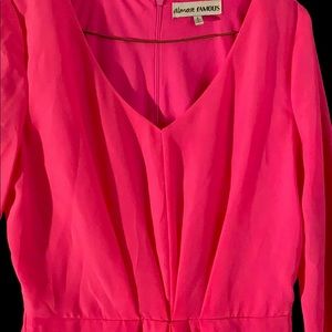 STATEMENT PIECE! All girls love pink so you can’t go wrong with this fancy pink romper with pleating in the front and back around the waist band to accentuate the curves. This romper zips down the back and has elastic around the end of the sleeves. This piece has been lightly worn but no tears, runs, or stains. This would be great for girls night out or an anniversary dinner to wow that special someone!