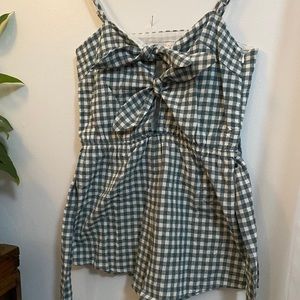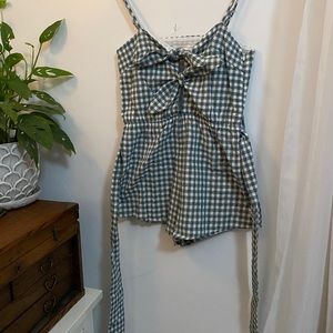 Checkered linen romper - two self ties on chest- adjustable straps - elastic waistband with self wrap tie belt